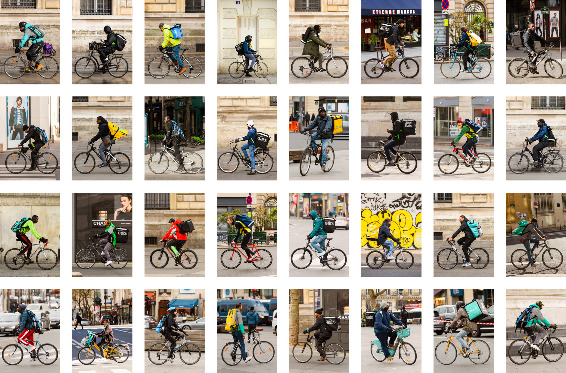 Rapides, toujours en mouvement, il n’a pas été facile de les rencontrer, ni de gagner leur confiance. Ils m’ont expliqué leurs conditions de travail, les passages obligés édictés par les sociétés de livraison et par une économie de service au modèle intenable.